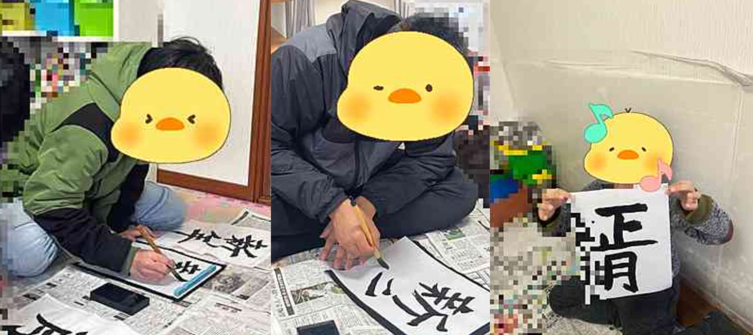正月と新年という字に挑戦したみんなは、思うように筆を使うことができず苦戦していました…( ^ω^ )