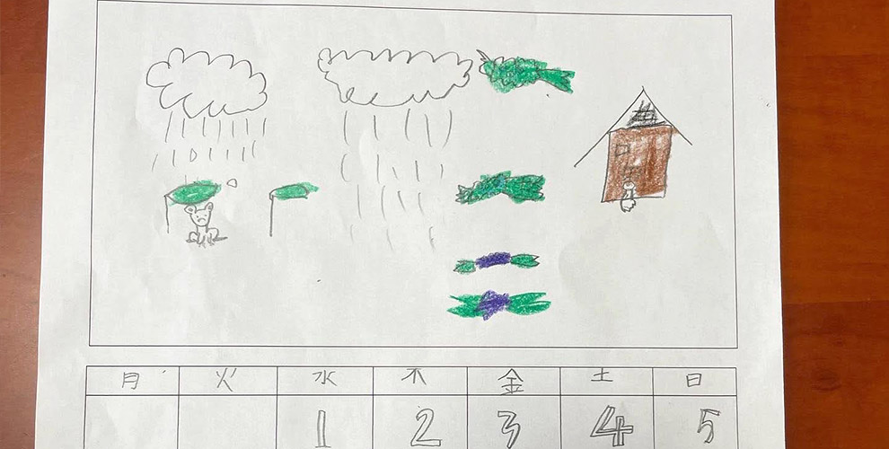 6月っぽい絵を描いてほしいとお願いすると、「雨」「カエル」「あじさい」の絵を描いてくれました(o^^o)